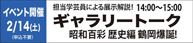 昭和 100 年を記念して開催する展覧会第 1 弾。旧鶴岡市が発足して 102 年、平成の大合併によって現在の鶴…